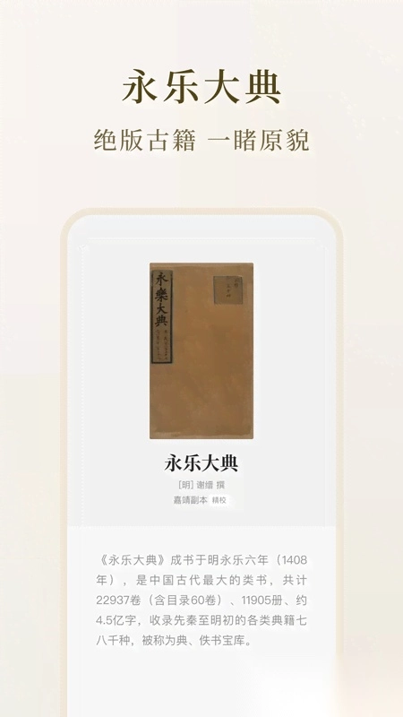 1. 珍稀原版古籍:辑录《永乐大典》《帛书版道德经》等稀见珍本,覆盖经史子集各类典籍文献;哈佛燕京图书馆等机构的珍贵馆藏资源首次通过数字化形式对外公开。