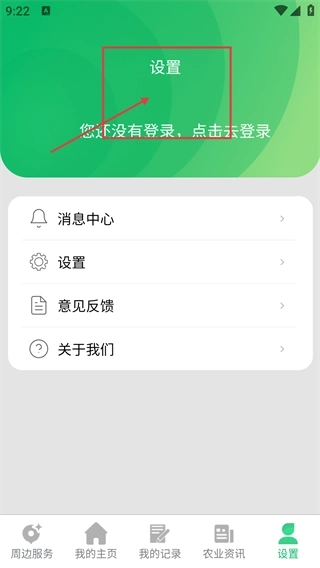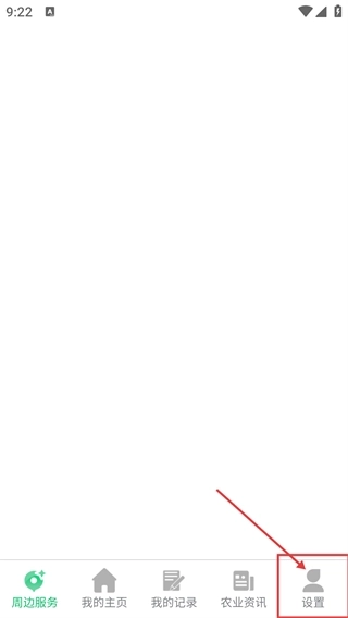 1、打开软件界面后,底部功能栏设有【周边服务】【我的主页】【农业资讯】【设置】这几个选项,点击【设置】就能进入相应的功能操作界面。