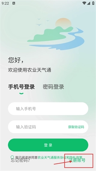 3、进入【农业天气通】的登录界面后,可选择【手机号登录】或【密码登录】两种方式,若需创建新账号,可点击界面下方的【注册账号】进行操作。