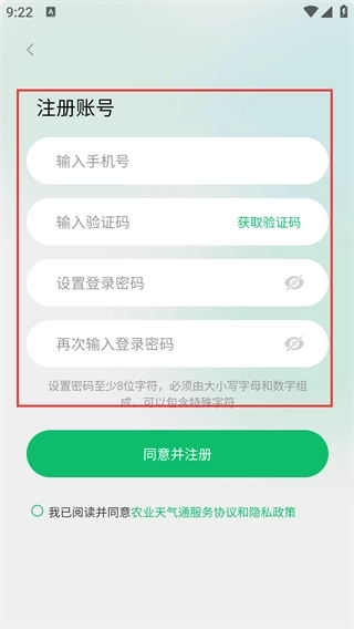 4、进入【注册账号】界面后,需要填写【输入手机号】和【输入验证码】,接着设置【登录密码】——密码要求至少8位,且包含大小写字母与数字,之后还需再次确认该密码。