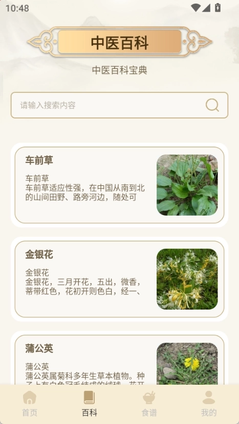 2、切换至助力中医“百科”标签,即可搜索或浏览药材的图文介绍。