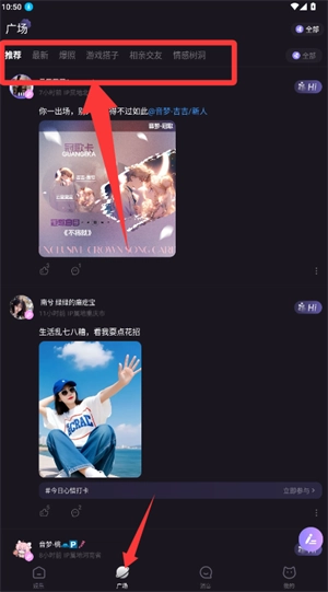 进入方形页面后,您可以在推荐或最新标签里挑选感兴趣的内容类别。