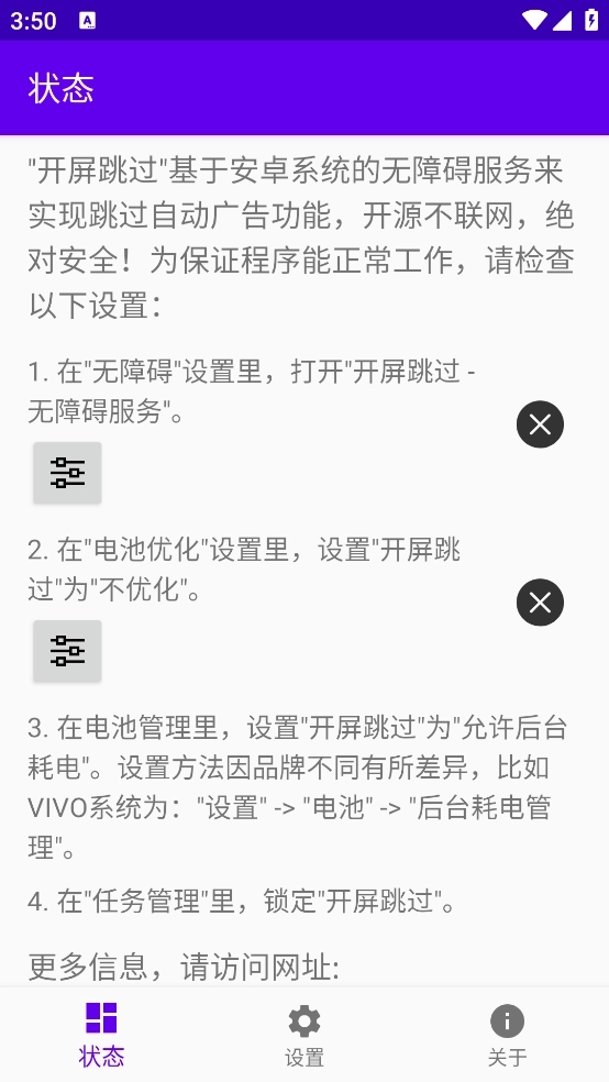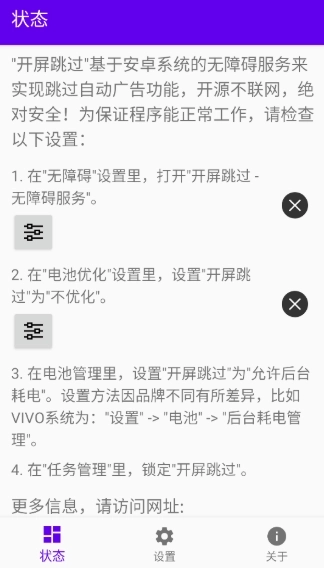 开屏跳过是一款功能强大的广告跳过工具,可智能识别并跳过弹窗、文字等各类开屏广告,为用户节省时间与流量。它能自动跳过应用开屏广告,界面简洁、操作简单,不会占用过多手机资源,且兼容大多数应用,不影响应用正常使用。