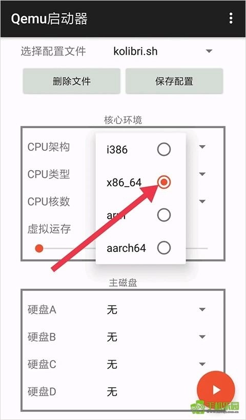 3、接下来配置需要模拟的CPU架构,我要模拟的系统是Windows 7 32位,因此CPU架构可选择i386(x86)或x86_64(amd64),这里我选择x86_64;