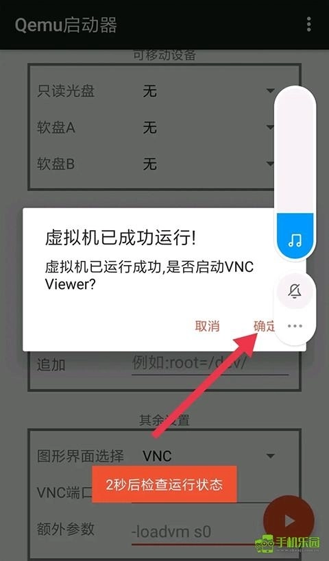 7、接着授予存储权限,之后设置上网方式,务必选择user!启动成功后,点击确定以打开vnc。