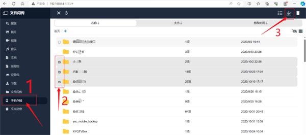 3、手机向电脑传输文件的操作步骤:先选择手机存储位置,接着选中需要传输的文件,最后点击对应的传输按钮即可。