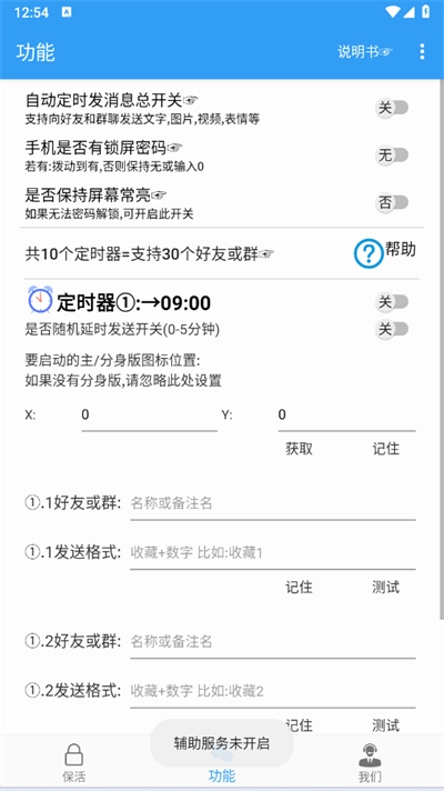 2、在功能界面里,点击开启自动定时发消息的总开关,就能启用自动发送信息的功能了。