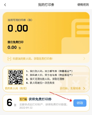 找到【我的打印券】入口,新用户首次注册后点击【领取】按钮,就能拿到免费的打印券。