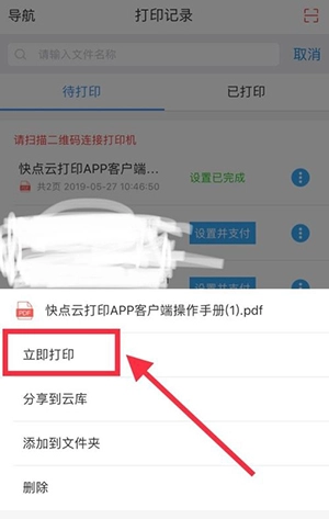 当支付流程结束后,已付款的待打印文件状态会更新为“配置就绪”。此时点击文件右侧的三点菜单图标,选择“马上打印”选项,系统会弹出扫码连接界面。您可以通过扫描打印机上的二维码完成设备配对,也可以手动输入打印机编号并确认。操作完成后,打印记录区域会显示文件正在传输,待传输进度条走完,稍作等待,文档就会自动输出了。