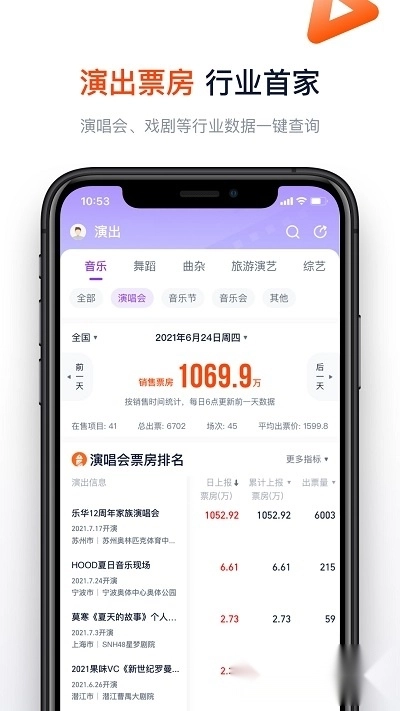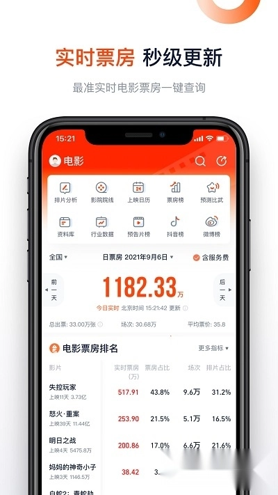 可以实时获取以秒为单位更新的票房数据,既能了解整体市场及各影片的票房表现,也能根据上映档期或不同地区来筛选查询电影票房等相关统计指标。