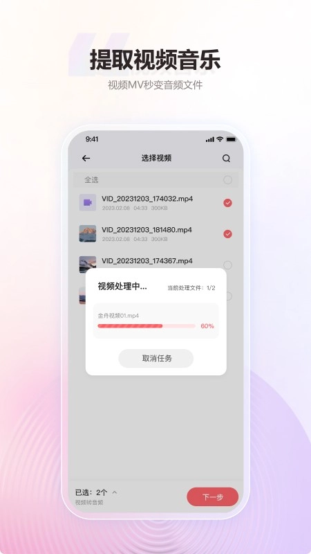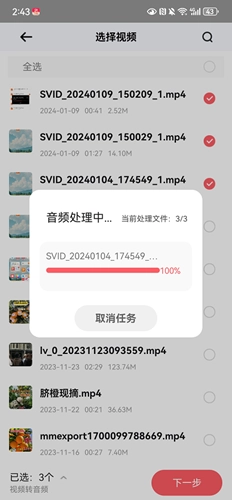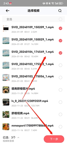 根据实际需求,勾选想要转换成音频的视频文件(支持多选),然后点击“下一步”按钮。