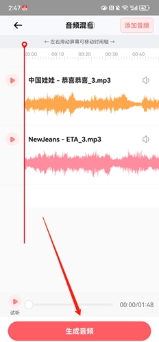 在这里,你可以根据实际需求对混合片段进行调整,左右滑动屏幕就能移动时间轴,点击“添加音频”按钮还能继续导入新的音频素材来完成混音操作。