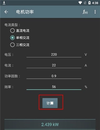 完成电流类型的选定后,填入对应的电压、电流、功率参数,系统便会生成相应的计算结果。