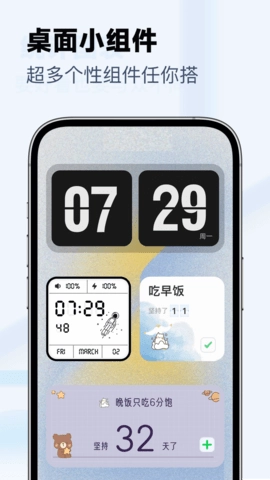 翻页时钟除了基础的时间显示外,还整合了悬浮时钟与秒表功能,方便用户随时掌握时间并进行计时操作。无论是参与整点抢购这类需要精准把握时机的活动,还是应对其他分秒必争的场景,它都能助力用户高效利用每一刻。此外,翻页时钟还配备了桌面小组件功能,用户可根据个人喜好和实际需求,挑选不同样式的小组件,轻松打造出兼具个性与实用性的专属手机桌面。