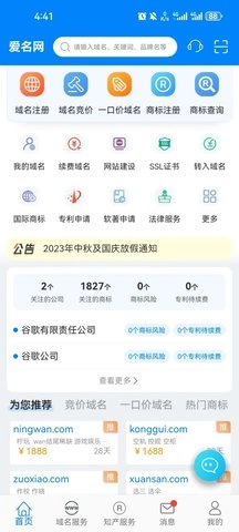 爱名网是一款专业的域名服务软件,软件是由爱名网自主开发的,主要功能是提供域名和商标知识产权方面的工具,这款应用是一个手机客户端,集成了域名查询、域名注册、商标注册、域名抢注、知识产权等多种功能。它是国内专业的域名商标应用。