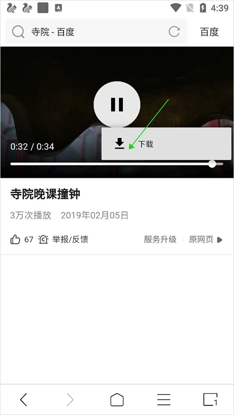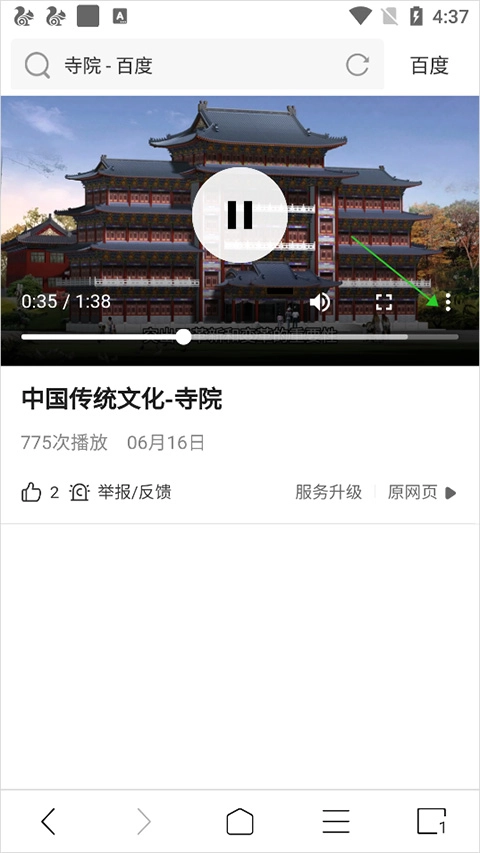 用户在视频播放页面点击播放画面后,播放画面底部右侧会弹出扩展功能按钮(即下图中绿色箭头所指向的按钮)