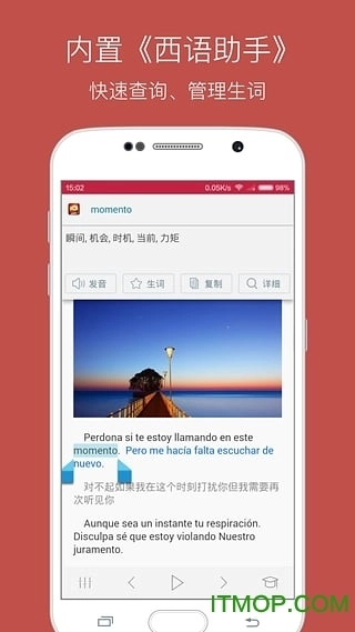 ? 精选西班牙及拉美主流媒体音频(如RTVE、BBC Mundo、Radio Nacional),每日更新,原汁原味不滞后;? 每周由专业西语编辑人工筛选+深度加工学习包,涵盖新闻、文化、生活、考试等多维主题;? 高频日常会话、经典名人演讲、影视原声片段等实用语料库;? 独家「语音高亮跟随」技术,播放时句子自动高亮、单词逐词跳显,视听同步,理解零断层。