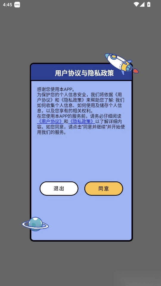 打开软件后阅读“用户协议与隐私政策”,点击“同意”按钮即可进入。