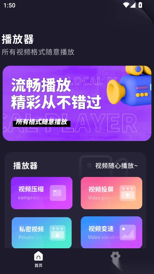 启动时首页会自动加载本地视频文件,附带缩略图,点击即可直接播放。