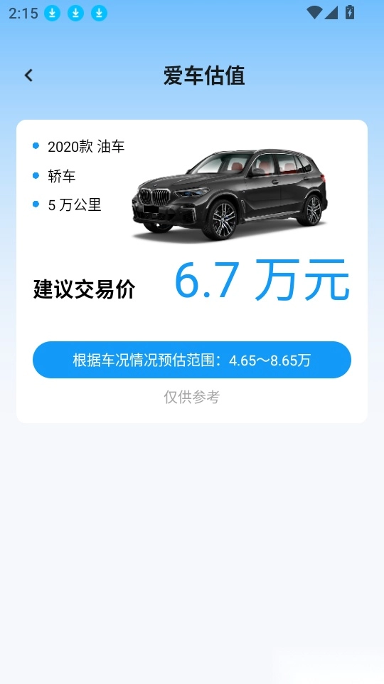 在软件首页的功能区域里,点击“爱车估值”按钮,即可进入下一步操作。