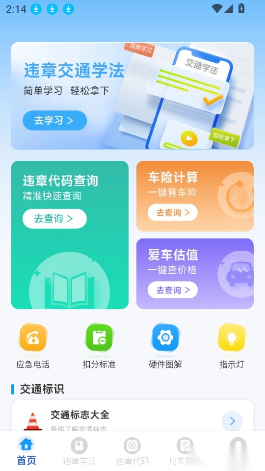 123违章代码速查是一款面向车主的多功能工具类应用。它整合了交规学习、生活记账、汽车估价等实用功能,助力用户一站式获取全面交通相关服务:在这里,用户可学习丰富的交通法规知识,借助海量题库练习刷题,高效巩固交规内容;平台提供的实时精准汽车估价服务,能帮助用户准确预估爱车价值,为估价交易提供安全可靠的参考;此外,应用贴心的生活记账助手,支持用户清晰记录生活账单与车辆开销明细,实现便捷的记账管理。有需要的用户不妨前往本站体验使用!