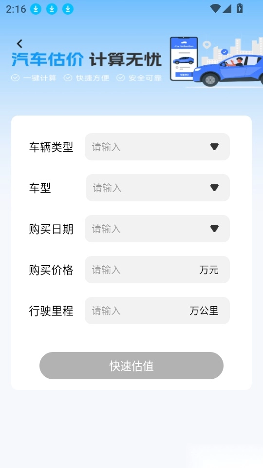 之后就能填写自己车辆的基本信息,点击“快速估值”按钮进入下一步操作。