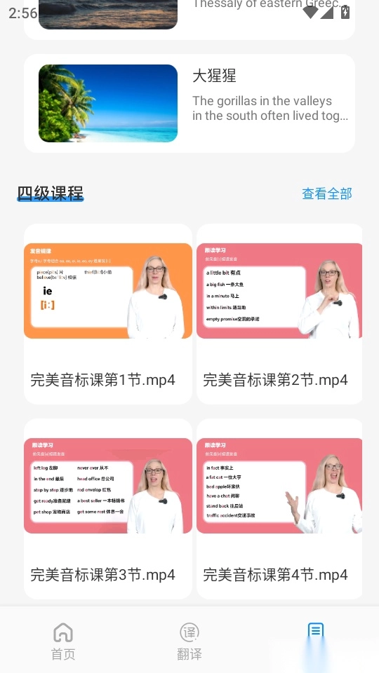 之后在新的菜单界面滑动到最底部,找到“四级课程”模块下方的视频链接并点击进入。