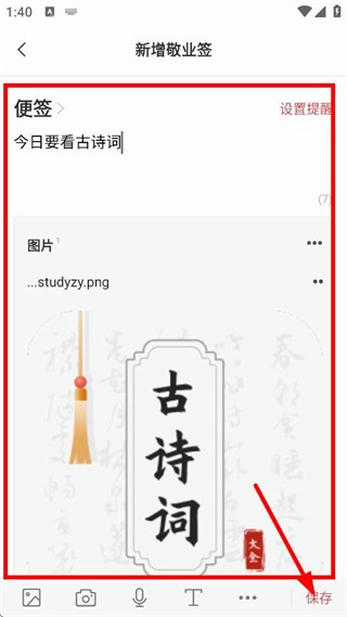 在敬业签的界面中,输入便签内容并添加图片后,点击保存按钮,即可完成新便签的创建。