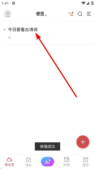 保存后,便签页面会显示新增的便签(如“今日要看古诗词”),并提示新增成功。