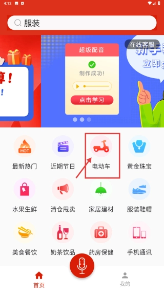 打开配音类应用,点击电动车分类选项,进入电动车配音模板列表页。