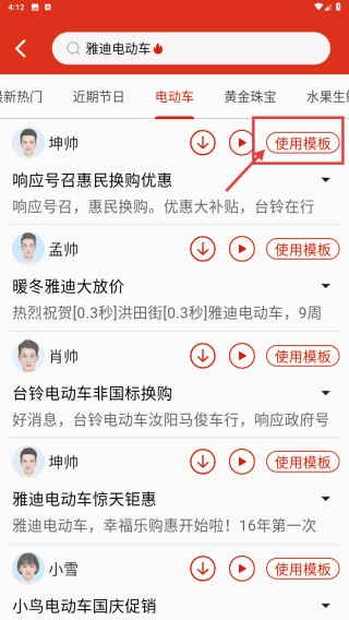 在模板列表里,挑选你想要的配音模板(比如坤帅的电动车促销模板),点击“使用模板”就能进入配音制作页面啦。