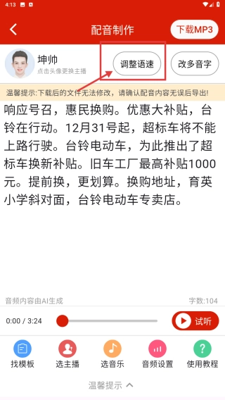 从挑选声音、剪辑文案到加入背景乐,整个流程操作简便,动动手指就能搞定,不用具备专业能力,就能迅速制作出促销语音广告。