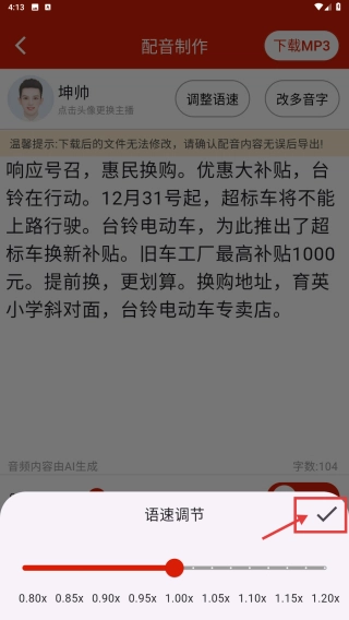 在语速调节界面,设置好合适的语速后,点击确认图标,即可完成语速设置。