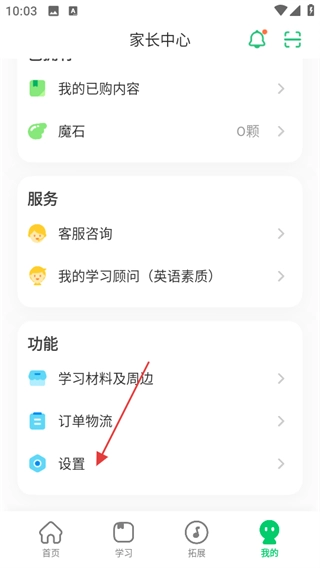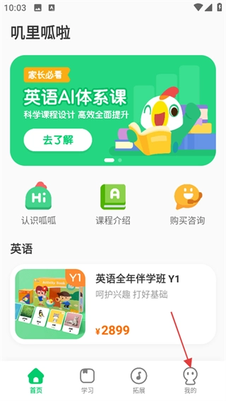 1、打开叽里呱啦APP进入首页,点击底部导航栏的“我的”选项,即可进入家长中心页面。