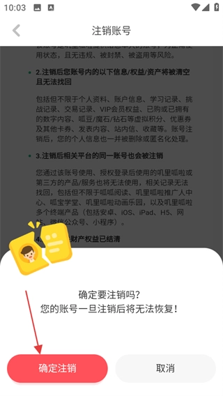 5、进入注销确认页面后,点击“确定注销”按钮,即可完成账号注销流程。
