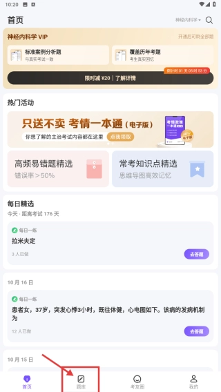 1、启动医学考试学习类应用,点击底部的题库按钮,进入题库界面。