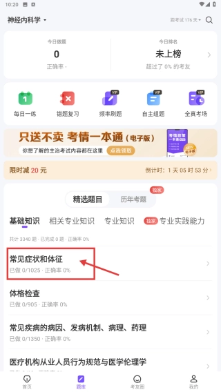 在题库页面,选择“常见症状和体征”分类,然后浏览该分类下的知识点列表。