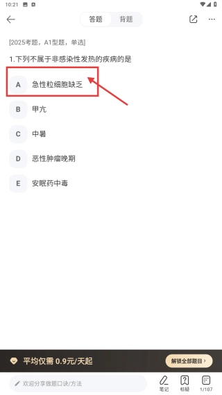 4、在题目练习页面,以2025年单选题为例,选择正确答案“A急性粒细胞缺乏”,完成该习题的练习操作。