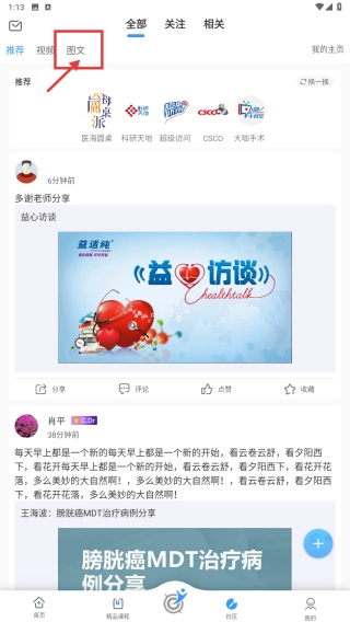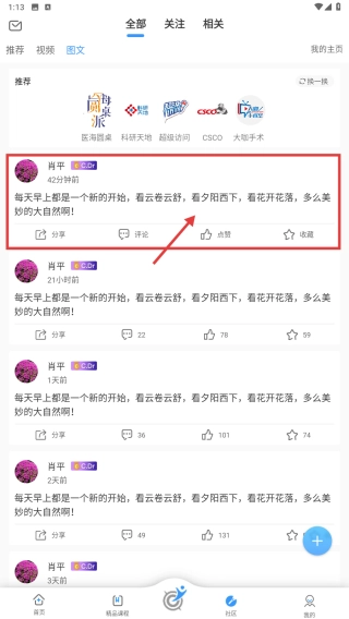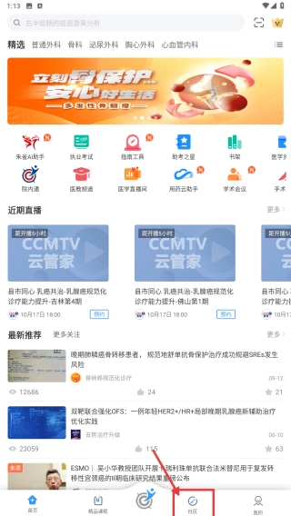 1、打开医学知识分享类应用,点击底部的社区选项,进入社区页面。