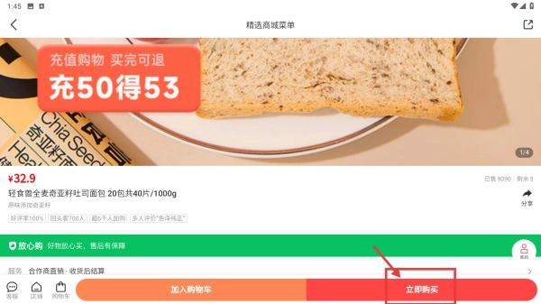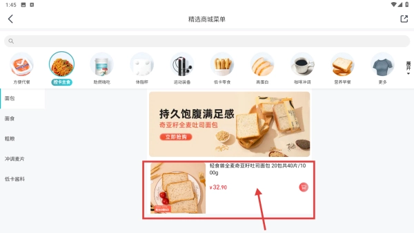 3、在商品列表里,找到并点击目标商品(例如轻食全麦奇亚籽吐司面包),即可进入该商品的详情页面。