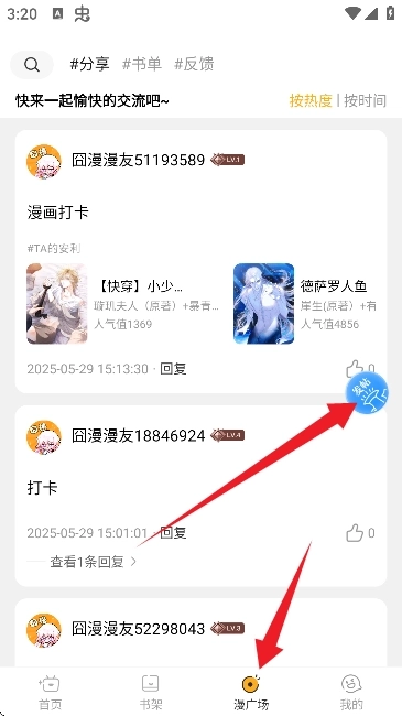 5、在漫广场里,大家可以开展交流互动,比如分享书单、交流阅读感悟等。要是想发帖的话,点击右侧的蓝色按钮就可以啦。