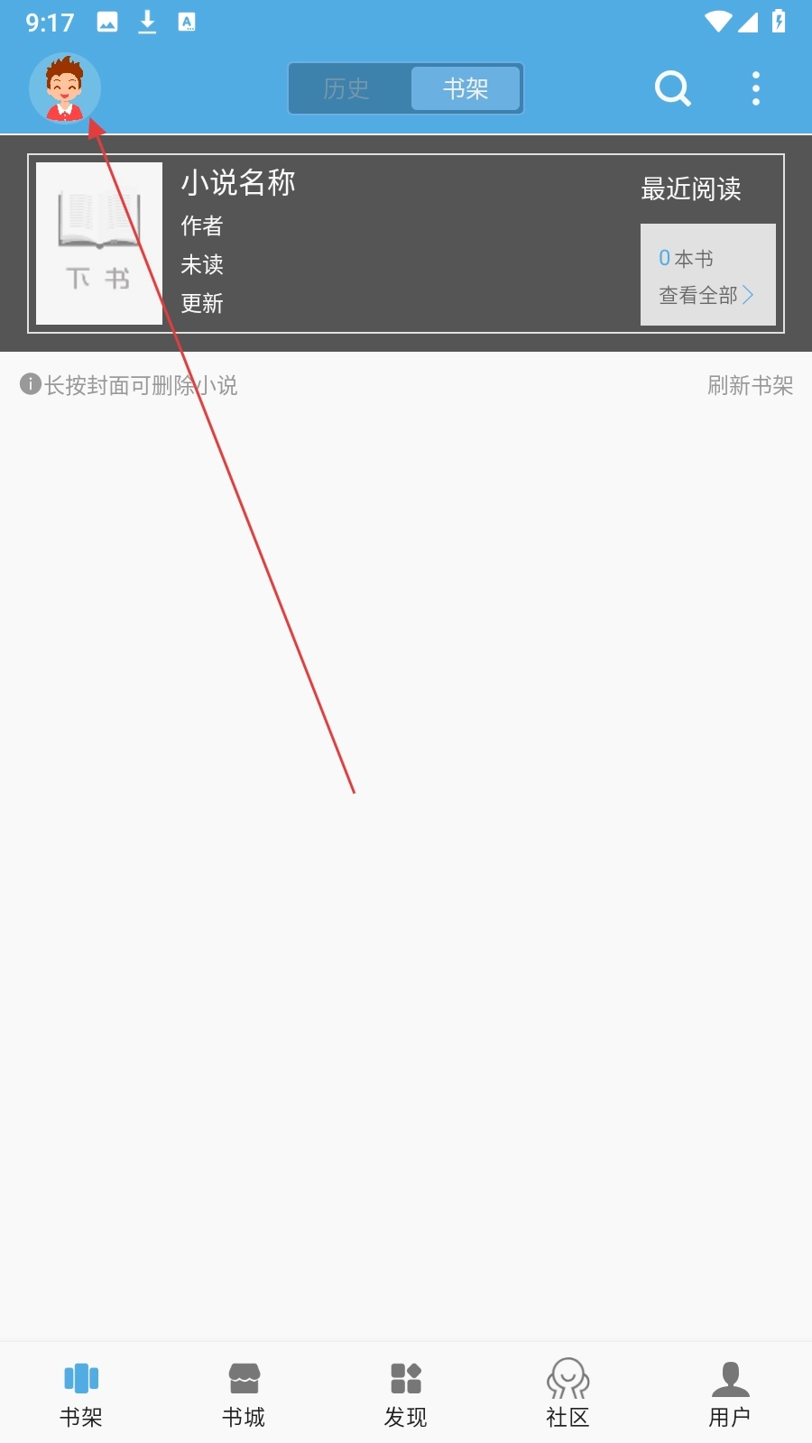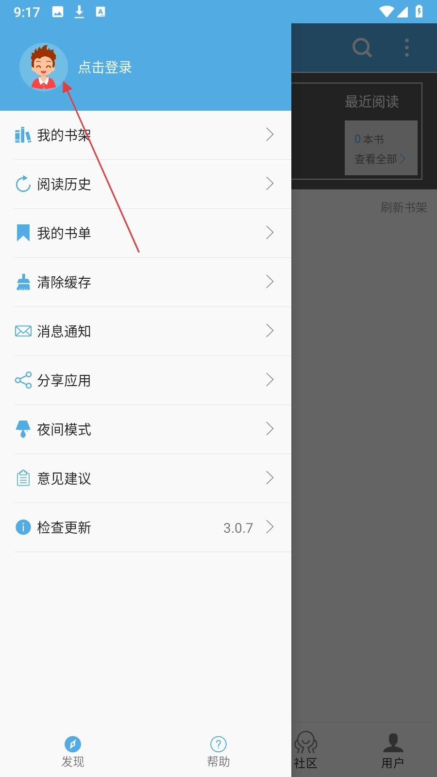 1、在书架页面,点击界面左上角的头像图标,即可展开个人功能侧边栏。