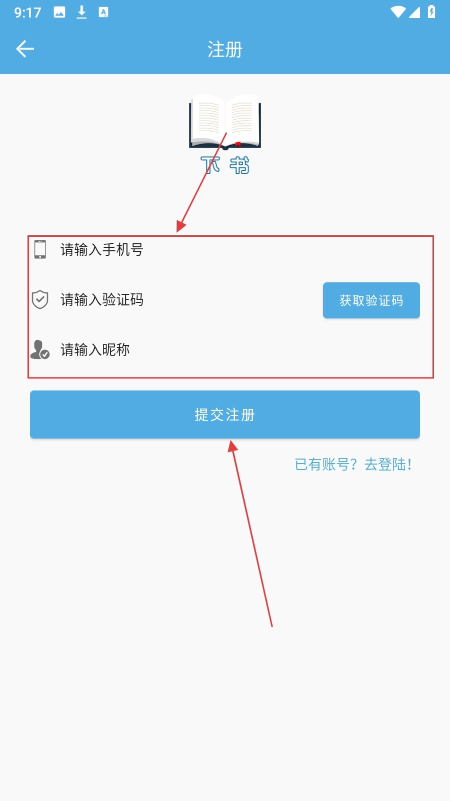 4、进入注册界面后,依次填写手机号、验证码与昵称,随后点击【提交注册】按钮,就能完成账号注册流程。