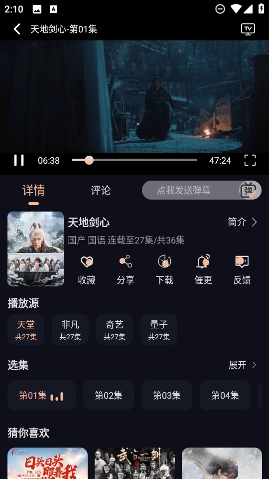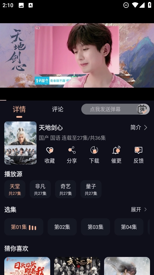 2、随后随意播放一部自己喜欢的影视资源,这里我以“天地剑心”为例,点击右上角的“tv”图标。