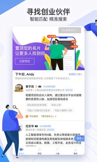 1、通过对创业相关标签开展数据挖掘工作,为创业者智能匹配并推荐契合其需求的个性化合伙人。