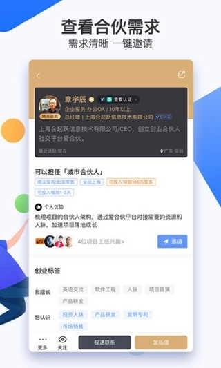 4、一键联系感兴趣的合伙人,多渠道全方位消息传达