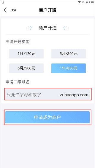 (3)接下来是申请你网站的二级域名,按照提示输入你预先拟定的名称后,点击“申请成为商户”按钮,之后等待工作人员的审核通知就行。