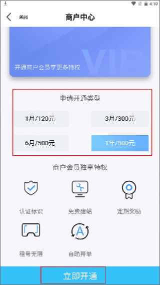 你挑选你要申请开通的类型,知晓商户会员专享的特权,接着点击立即开通。