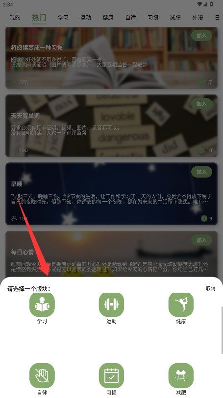 3、从预设的学习、健身等分类中选择适合的打卡类型选择一个模式,进入详细设置界面。