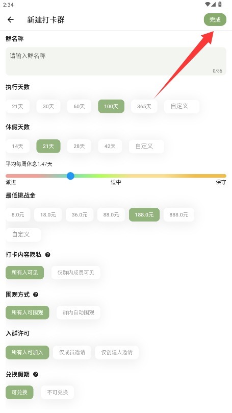 4、完善群组基础信息,包括名称、打卡周期、休息日设置及保证金金额等必填项后提交。